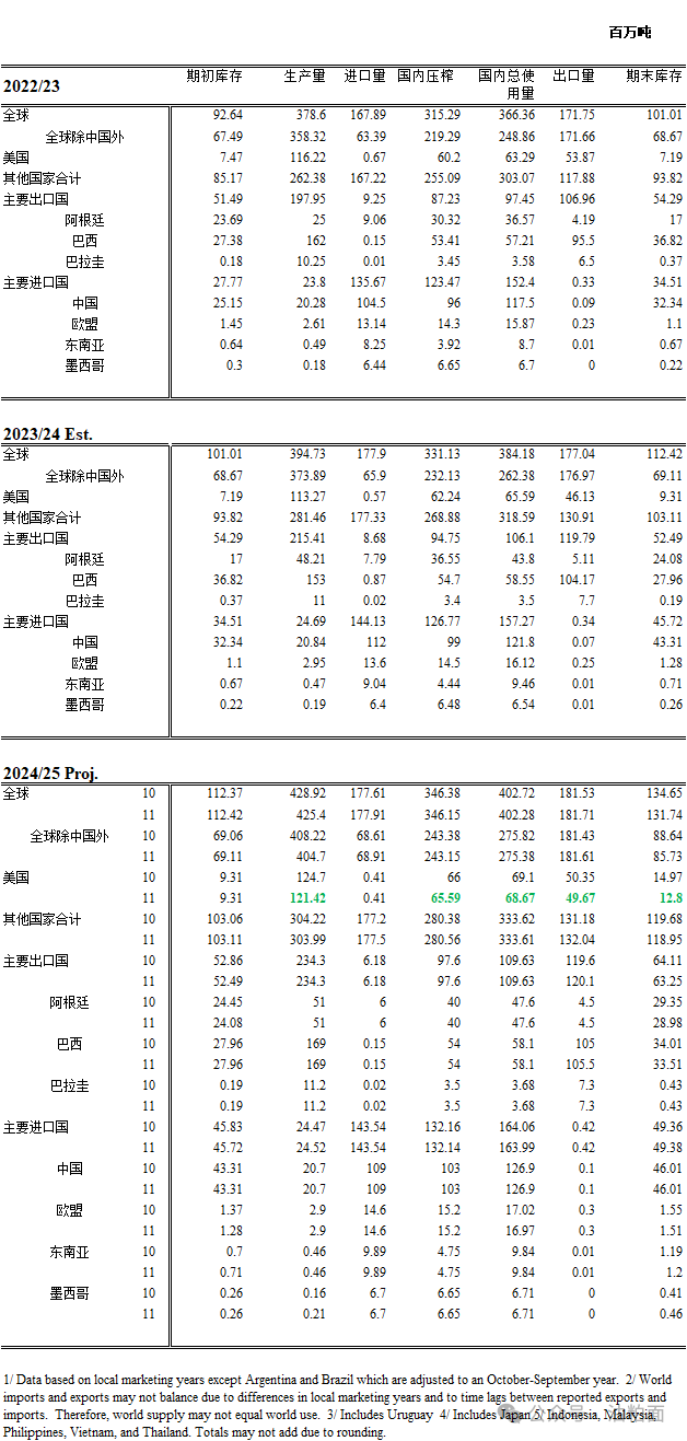 全球2024/25大豆供需预测包括产量下降、出口增加、压榨减少和期末库存减少。全球2024/25年度大豆产量下调350万吨至4.254亿吨,主要原因是美国和印度产量下降。根据印度大豆加工协会(SOPA)的信息,印度的产量下降了20万吨,降至1260万吨。全球大豆出口因巴西、加拿大和贝宁出口量增加而上调,但美国出口量减少在很大程度上抵消了这一影响。巴基斯坦的进口增加了。巴基斯坦增加的压榨量被美国较低的压榨量所抵消。全球大豆期末库存减少290万吨至1.317亿吨,主要原因是美国、巴西和阿根廷的库存减少。
