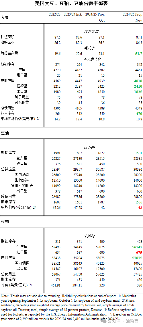 美国2024/25年度大豆供应和使用变化包括产量、出口、压榨和期末库存下降。美国大豆产量预计为45亿蒲式耳,因单产下调而减少1.21亿蒲式耳。产量变化最大的是爱荷华州、伊利诺伊州和明尼苏达州。由于迄今为止的供应和销售下降,出口量减少了2500万蒲式耳,至18亿蒲式耳。压榨量下调1500万蒲式耳至24亿蒲式耳,反映出豆粕国内消费和出口减少。大豆期末库存下调8,000万蒲式耳至4.7亿蒲式耳。